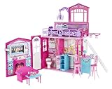 BARBIE® Glam Vacation House: Barbie® doll's fabulously glam vacation house is the ultimate in pinktastic play! Features 2 stories and 6 areas of glam-o-rama play including living room, bedroom, kitchen, bathroom, patio, and breakfast bar. Clip n' flipTM pieces such as TV, chandelier, and tiki lights can be arranged and rearranged around the house in different rooms for customization. Includes couch, bed, breakfast/patio bar and blender. Folds up super neat for glam play on the go! For ages 3 and